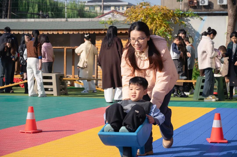 活晨光中,孩子们牵着家长的手完成亲子签到,在签名墙上留下专属印记,温馨氛围瞬间拉满。区域游戏环节,家长化身“玩伴”,与孩子一同在建构区搭建“梦想城堡”、在美工区创作“五彩秋日画”,教师适时引导,捕捉亲子互动的暖心瞬间。户外体锻时间,暖阳下的操场格外热闹,家长或守护孩子尽情运动、或与孩子组队参与 “小车运宝“你做我学”游戏,欢笑声此起彼伏。集体教学活动中,班级教师根据幼儿的年龄特点和发展水平,充分挖掘课程资源,引导幼儿积极探索;家长们近距离感受着孩子们在活动中的专注、思考和成长。专室游戏中,孩子们在绘本馆分享故事、在科学室探索光影奥秘,孩子们在自主选择中发展个性,在多元体验中收获成长,家长们驻足观察,见证孩子在游戏中的专注与成长。